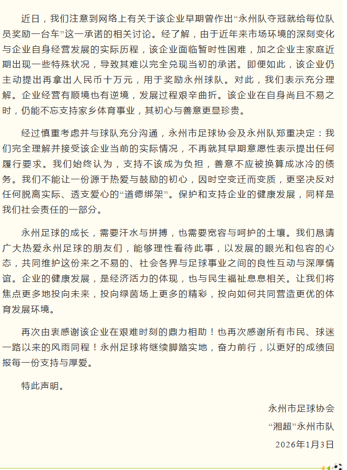 经过慎重考虑并与球队充分沟通,永州市足球协会及永州队郑重决定:我们完全理解并接受该企业当前的实际情况,不再就其早期意愿性表示提出任何履行要求。