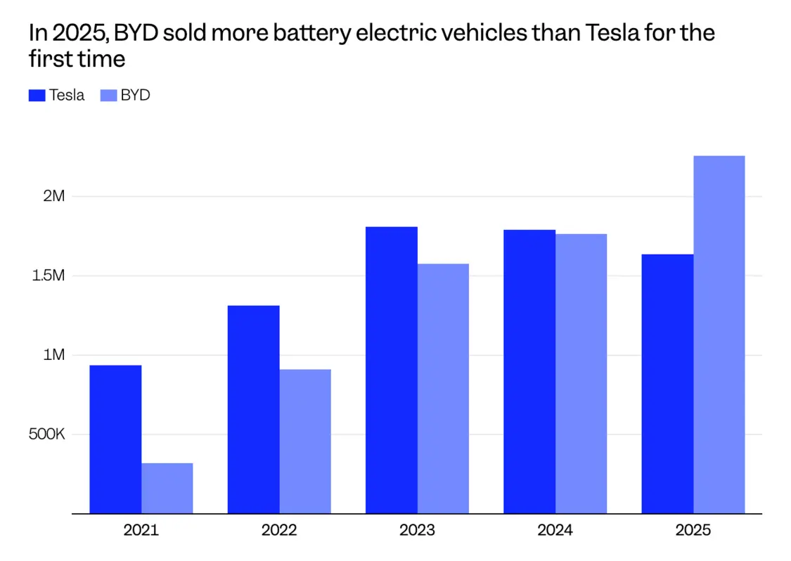 比亚迪周四公布的数据显示,该公司2025年纯电动汽车销量达到225万,较上年增长近28%。相比之下,特斯拉周五公布的全年销量为164万辆,同比下降8.5%