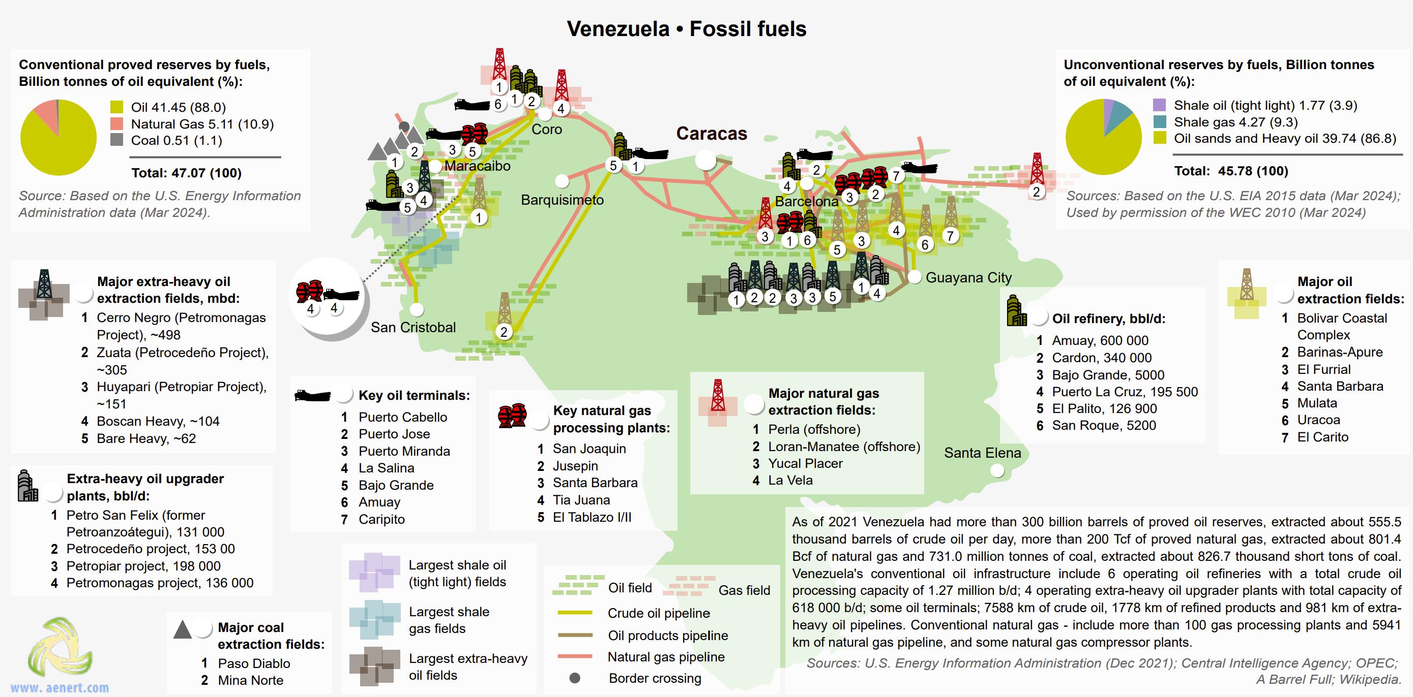 作为石油资源大国,委内瑞拉已探明储量约3030亿桶,占全球总量的17%,居世界首位。不过,其原油多为高硫重质、超重质原油,API度多低于20,需特殊加工与稀释剂调配才能管输和炼制,开采成本显著高于常规轻质原油。