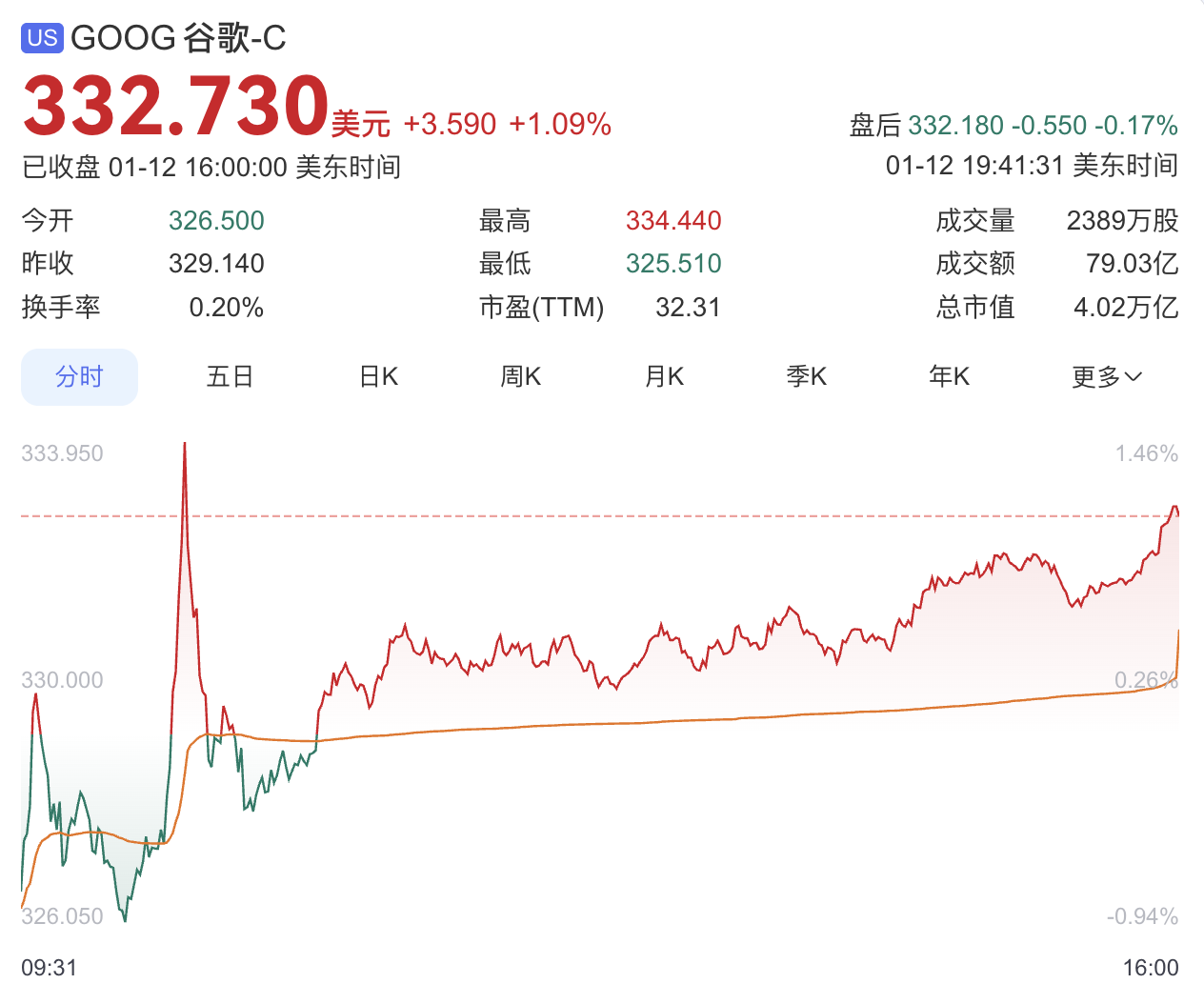 消息公布后,谷歌美股股价当日上涨1.09%,收盘价达332.73美元,市值首次突破4万亿美元关口,创历史新高。