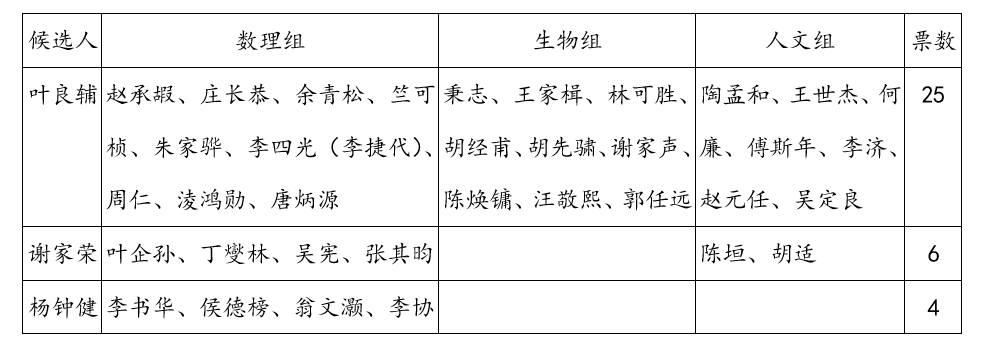 由表可见:第一,作为院长和评议会议长的蔡元培没有参与投票。