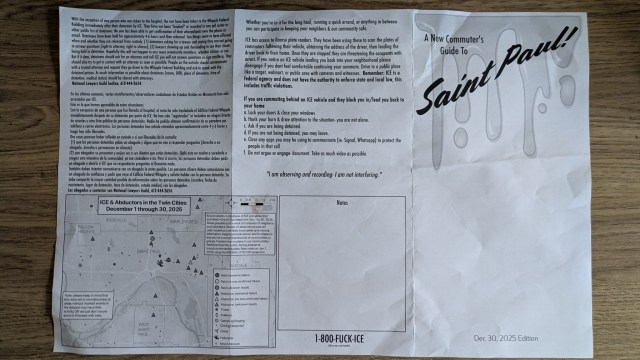 The other day I happened across a paper flyer at my neighborhood bar called “A New Commuter’s Guide to Saint Paul” (Dec. 30, 2025, edition). Inside is a map of the city showing a month’s worth of ICE abductions, along with detailed instructions about where to find missing people (printed in English and Spanish) and tips for what to do if you encounter ICE agents while driving. I wish Renee Good could have read this; it advises people not to roll down their car windows or engage with federal agents — tragic advice given Good’s last words.