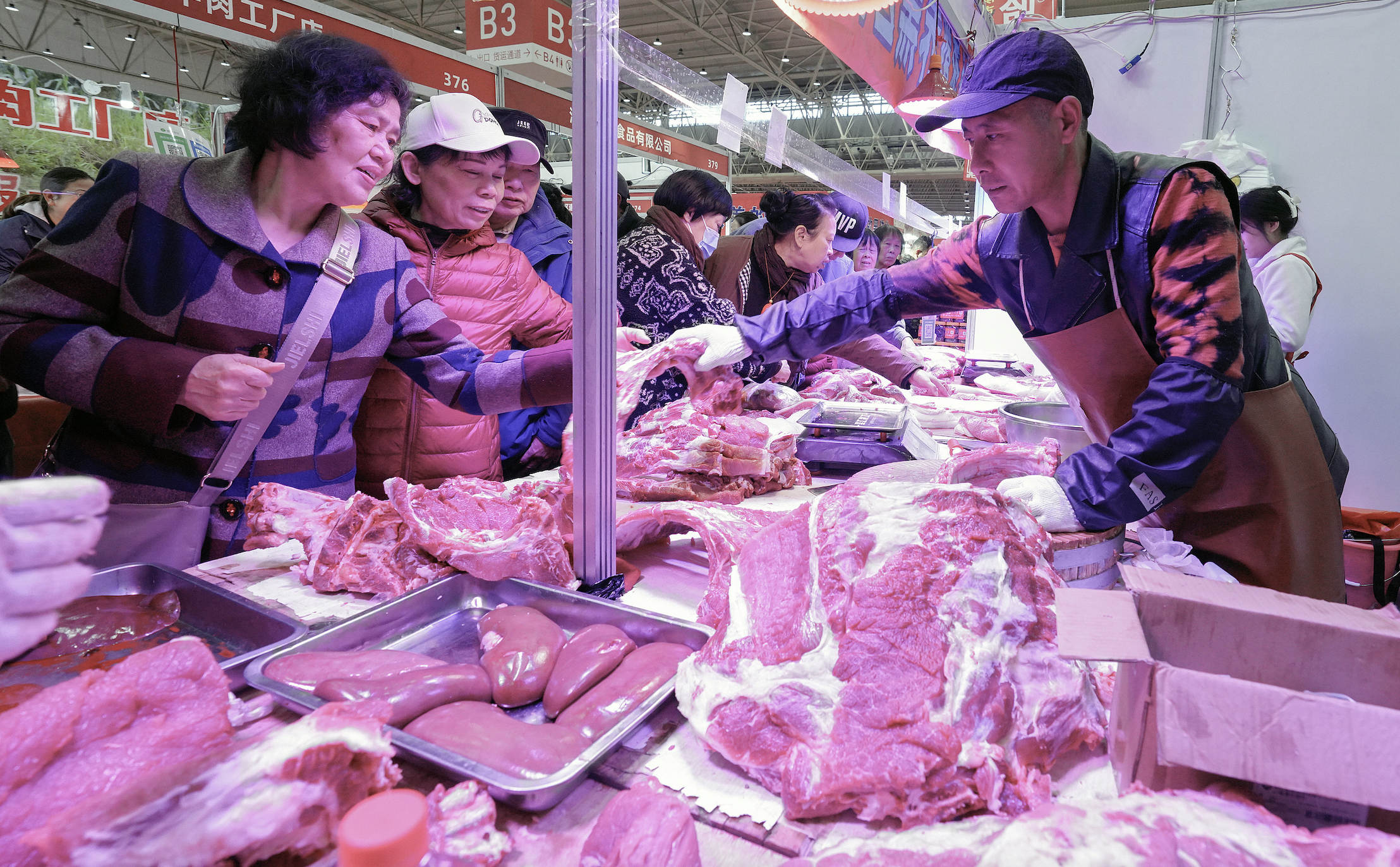 2024年12月6日,第32届中国食品博览会暨第2届湖北食品产业链博览会在武汉国际博览中心举办,市民踊跃购买土猪肉。图片来源:CFP