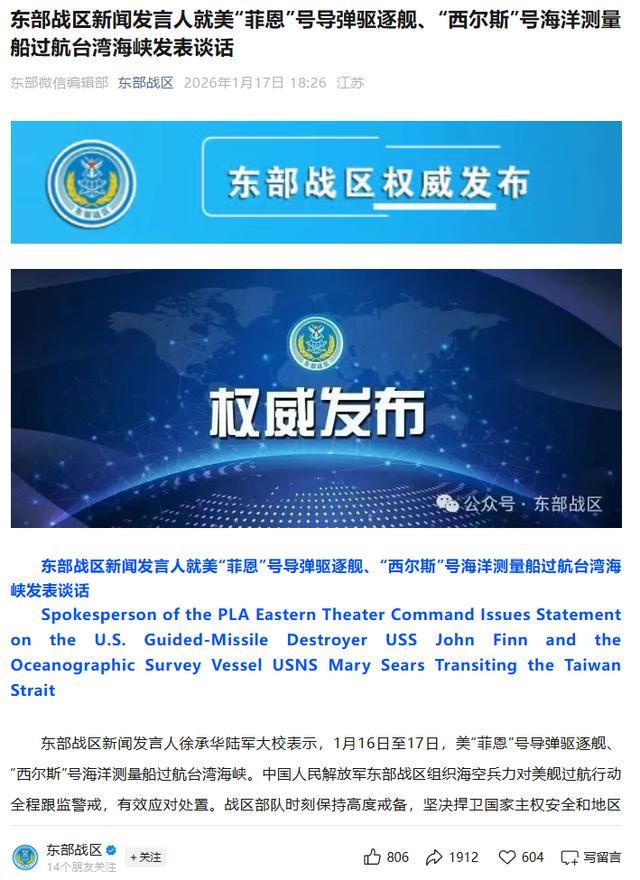 1月16日至17日,美海军“约翰·菲恩”号导弹驱逐舰与“玛丽·西尔斯”号海洋测量船组成小型编队,强行穿航台湾海峡。东部战区迅速组织海空兵力全程跟监警戒,本身并不令人意外,但真正值得警惕的,并不是那艘早已司空见惯的阿利·伯克级驱逐舰,而是隐藏在编队中的那艘特种监测船——T-AGS-65“玛丽·西尔斯”号。