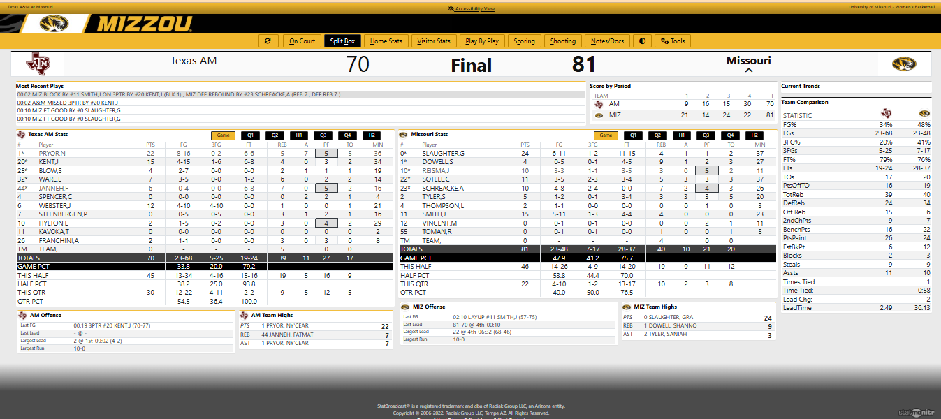 Texas A&M made a late push, scoring 30 points in the fourth quarter and cutting the final score down to just 11 points. But Mizzou kept them at bay with 22 points of their own, shooting 13-17 at the FT line. Slaughter scored another 10 points in the fourth for her third straight game of 20-plus points. Overall she has scored 20 or more 11 times this year.