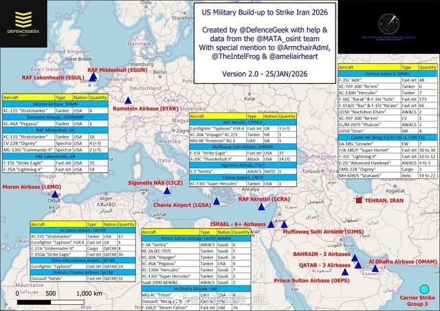 更值得警惕的是空中加油机的异常调动。多架KC-135从美国本土、德国、英国分批向西班牙莫龙基地、卡塔尔乌代德基地集结。这种路线组合,与半年前美军对伊朗发动“午夜铁锤”行动时高度相似。当加油机开始提前就位,往往意味着作战机群已经进入倒计时准备阶段。