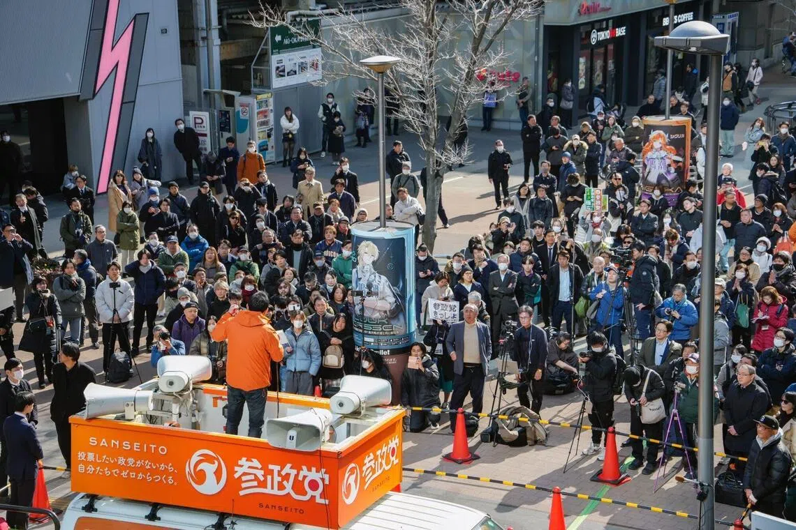 日本极右翼参政党党魁神谷宗币星期二在东京举行首场竞选活动,吸引上班族驻足围观。 (彭博社)