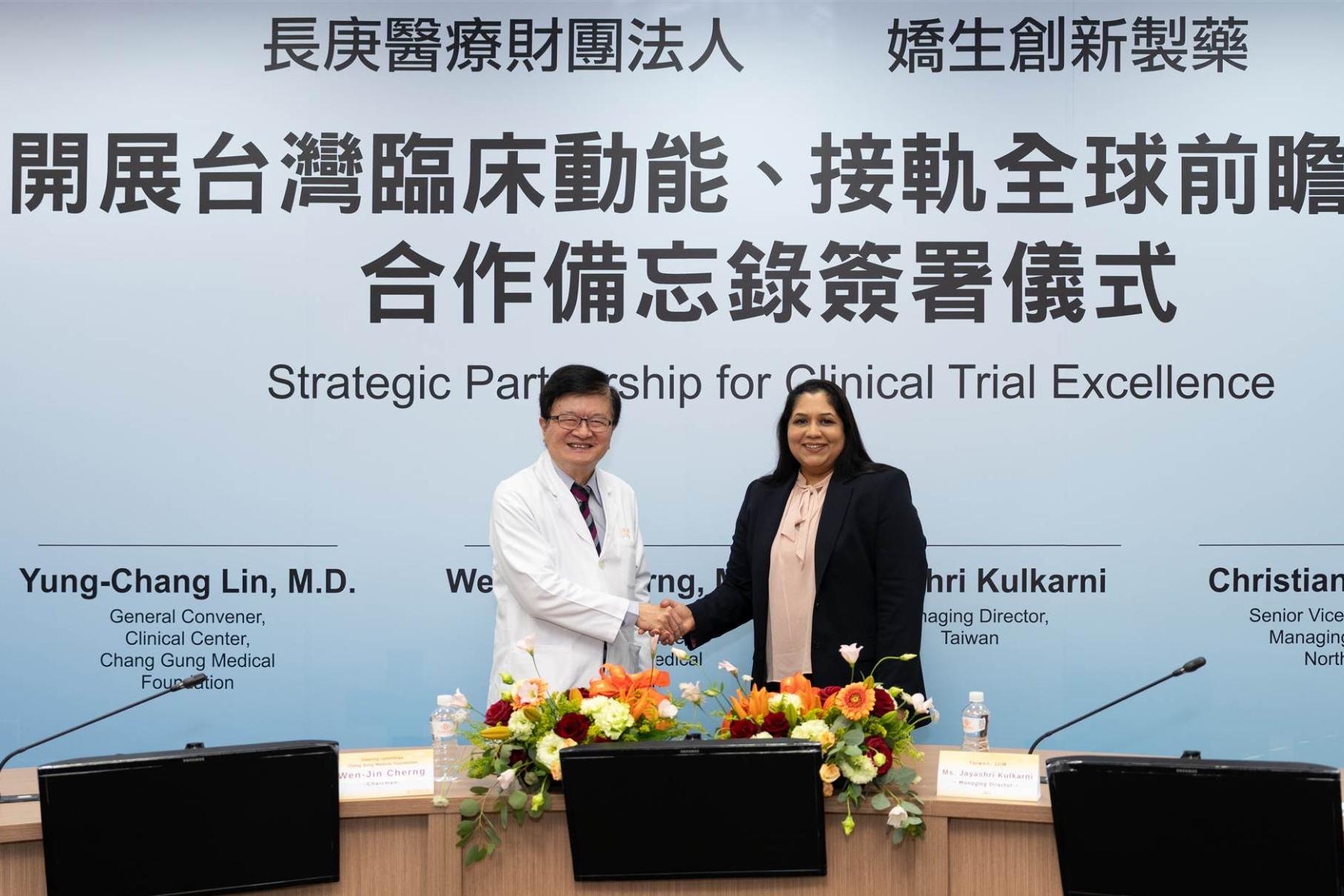 庚醫療財團法人程文俊主任委員(左)、嬌生創新製藥台灣市場總經理Jayashri Kulkarni(右)雙方宣告將深化長庚醫院和嬌生創新製藥在臨床試驗與研究領域的策略夥伴關係。(圖片來源/長庚醫院提供)