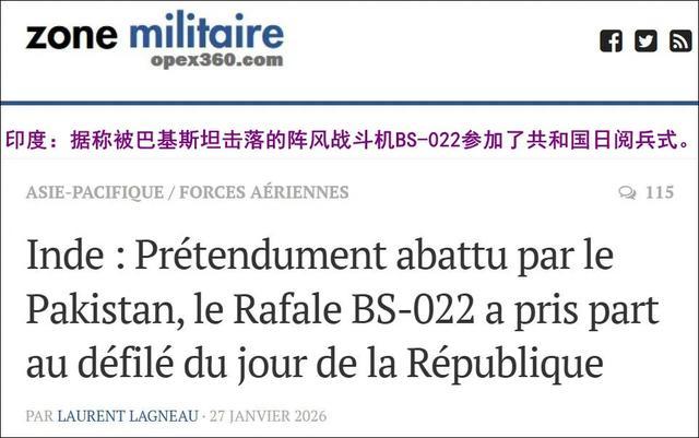 事情的导火索,是法国军事媒体 Opex360 援引印度媒体报道称:此前被巴基斯坦空军宣称击落、编号为 BS022 的印度空军“阵风”战斗机,在今年1月26日的印度共和国日阅兵式上公开现身,并参与了空中分列式飞行。法媒随即借机发难,指责英国杂志《Key.Aero》在去年的印巴空战报道中“完全采信巴基斯坦方面说法”,夸大了印度空军的损失。
