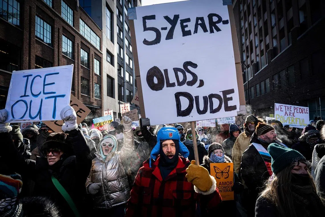 美国民众于1月23日走上明尼阿波利斯街头抗议,要求移民执法人员撤出明州。 (法新社)