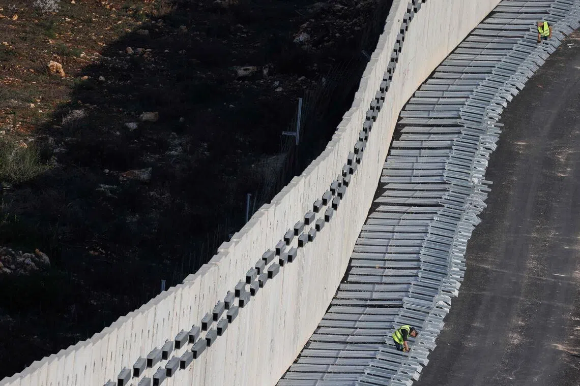 1月8日,以色列工人在分隔以色列北部和黎巴嫩南部的边境围栏上进行施工。 (法新社)
