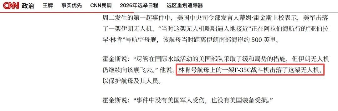 这恰恰是关键所在。如果只是为了阻止伊朗侦察,美军完全可以采取电子对抗手段。以“林肯”号航母编队的体系能力,从EA-18G“咆哮者”、E-2D预警机到岸基电子战力量,软杀伤“黑掉”一架沙赫德-129,并不是什么难事,而且还能做到不留痕迹、不给对方把柄。