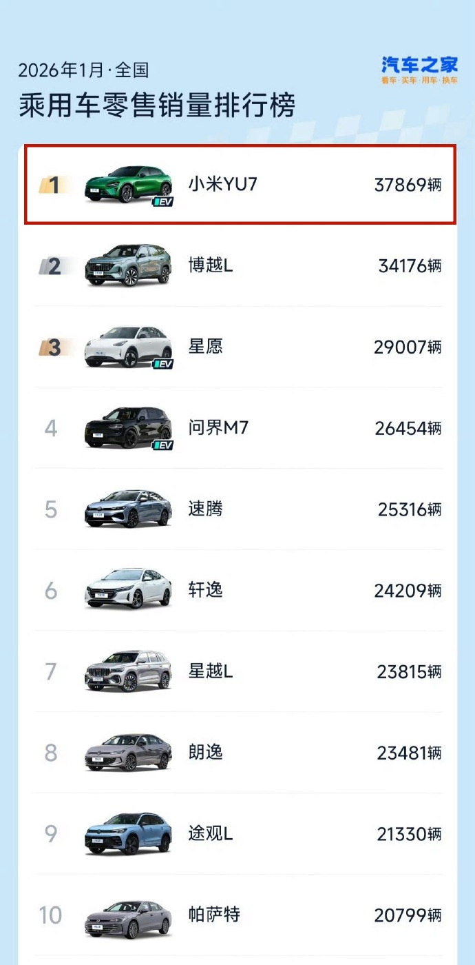 汽车之家的数据显示,在1月的全国乘用车零售销量排行榜中,小米YU7以显著优势位居榜首。排在第二位的吉利博越L销量为34176台;第三则是吉利星愿,销量29007辆。