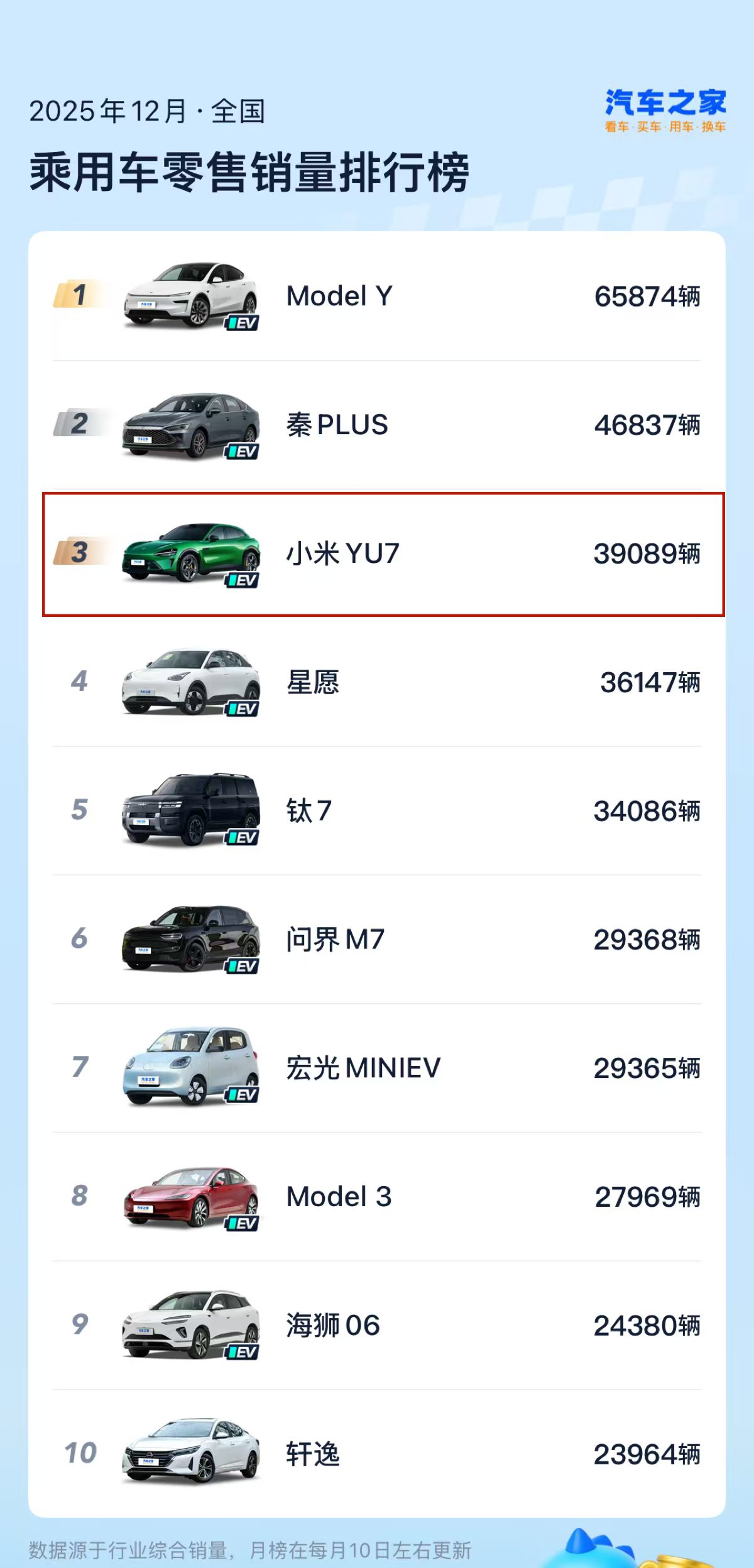在2025年12月的零售销量榜单中,小米YU7以39089台的成绩位列第三,仅次于特斯拉Model Y和比亚迪秦PLUS。