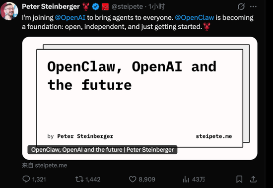 OpenAI 的 Sam Altman 也在 X 上宣布,Peter Steinberger 加入后,将致力于下一代个人助手智能体。