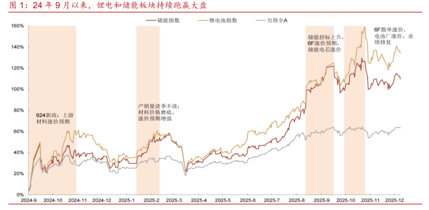 “从2024年9月以来,锂电与储能板块展现出了显著优于大盘的超额收益,行业正在逐步确认周期的地步拐点”。华西证券分析师指出,整个板块在经历“924新政”修复后,2025年逐步开启上行通道,尤其是进入下半年,驱动逻辑更加清晰:随着上游材料涨价预期的强化、储能招标需求的明显回暖以及电池环节价格体系的企稳,供需两侧形成了共振,“板块复苏不再仅限于上游价格与业绩修复的存量博弈,而是叠加了储能新需求的强力拉动”。