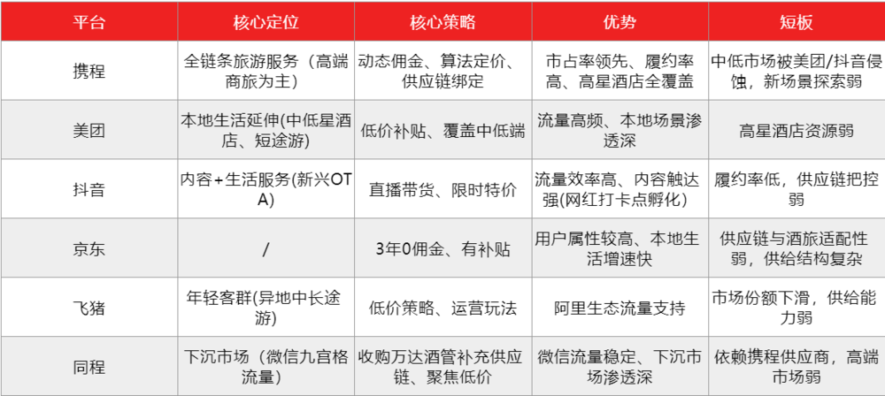 从业务逻辑来看,携程、去哪儿、飞猪优势在于商旅客群和以旅游目的地为属性的异地分发客群;而美团、抖音的主要发力方向在度假属性更强的中低星酒店。
