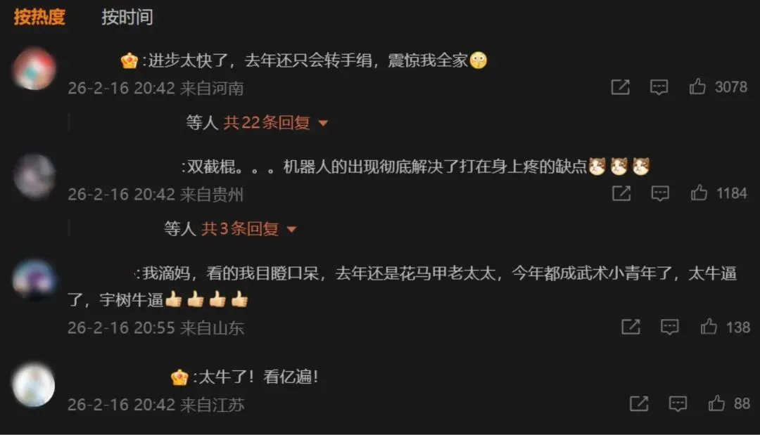 说实话,对比去年的原地站桩,今年春晚的宇树机器人连翻带打、招招到位,不说和人一模一样,这简直是在超越人类的边缘反复试探……