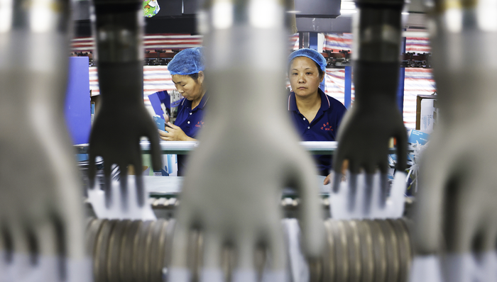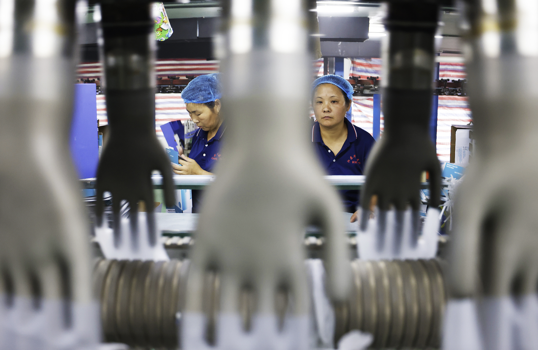 2024年9月7日,工人在泗洪县金锁镇工业园区一外资企业生产车间赶制供应国内外市场的一次性PVC手套订单。图片来源:CFP