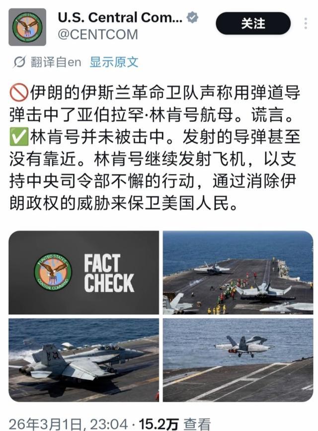 ▲美国中央司令部官方账号否认了林肯号被伊朗击中的消息