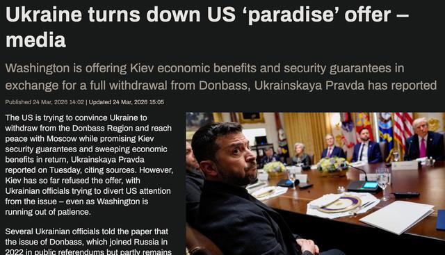 据俄罗斯RT报道,《乌克兰真理报》称,美国正在推动乌克兰从顿巴斯地区撤军,并以安全保障和大规模经济利益作为交换条件,试图促成与俄罗斯的和平协议。但乌方拒绝了美方的提议。多名乌克兰官员表示,顿巴斯问题依然是实现和平的关键障碍之一。乌克兰一直拒绝从该地区撤出,而俄罗斯则将乌克兰撤军视为实现可持续和平的前提条件。