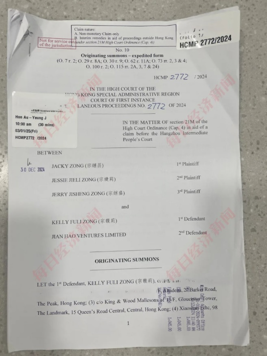 不久后,香港高等法院,一份冰冷的起诉书掀开了这个中国饮料帝国最隐秘的家族伤疤。宗继昌(Jacky Zong)、宗婕莉(Jessie Zong)和宗继盛(Jerry Zong)——三名持美国护照的“宗氏子女”,起诉宗馥莉与一家名为Jian Hao Ventures Limited的公司,要求获得宗庆后生前承诺的每人7亿美元信托权益,总额21亿美元。