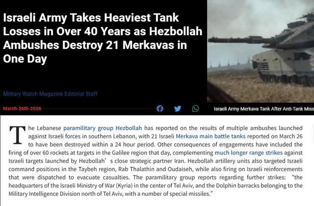 在以色列发起对黎巴嫩的大规模地面攻势后,局面并没有像前者想象的那样一帆风顺。日前,美国“Military Watch”网站援引多方数据,称黎巴嫩真主党以FPV无人机、反坦克导弹为主的反击,取得巨大成功,在24小时内消灭了21台“梅卡瓦”,这是以色列装甲部队40多年来遭遇的最惨重损失。