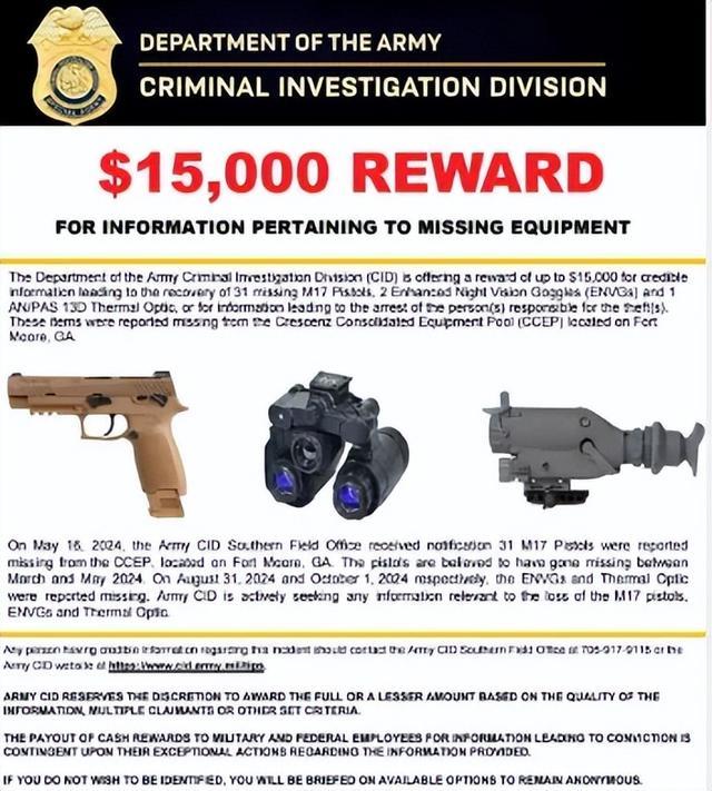 2024年7月,美国陆军三级准尉克里斯托弗·哈蒙德因在北卡罗来纳州自由堡盗窃并出售政府设备而被判处三年联邦监禁。据美国司法部称,哈蒙德在两年内至少获利180万美元。调查人员搜查他的住所时,发现了98支枪支、90个军用瞄准镜、夜视镜和超过10万美元的现金。