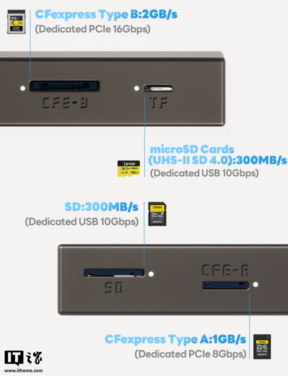 据介绍,该读卡器支持同时读取 CFexpress Type A、CFexpress Type B、SD(UHS-II)以及 TF 卡(microSD)四种存储卡,所有卡槽均采用独立通道设计,在同时插入多张卡片的情况下也能保持满速传输。其中 Type B 卡槽读速 2GB/s,Type A 卡槽读速 1GB/s,SD / microSD 卡槽读速 300MB/s,整机最大总传输速率可达 2790MB/s。