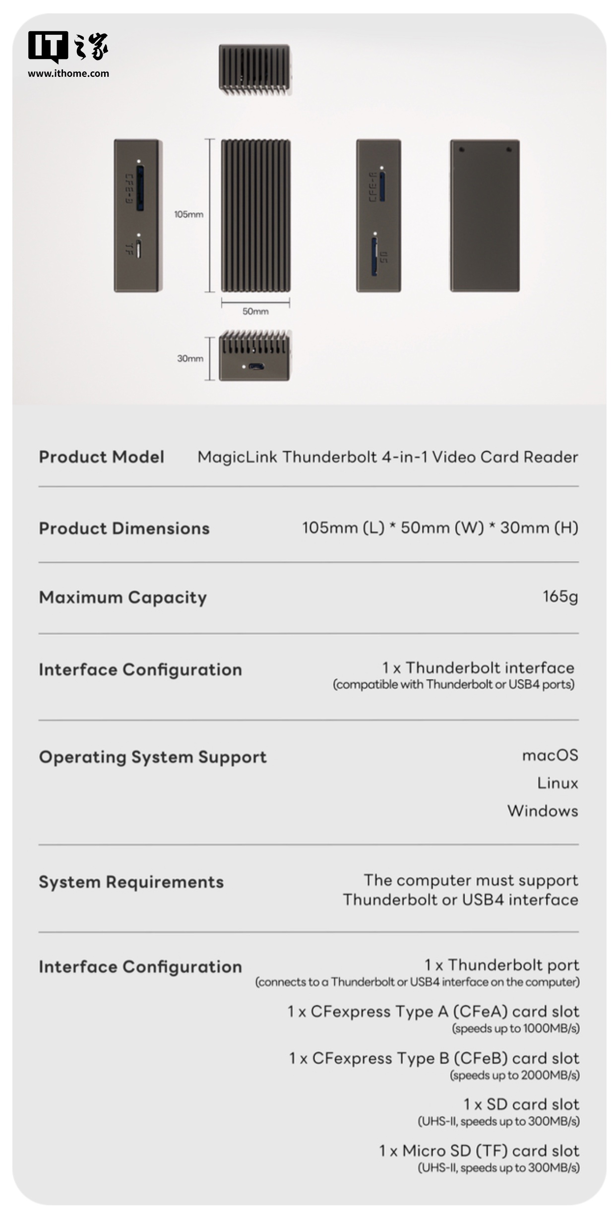 IT之家 7 月 19 日消息,制造商 MagicLink 现推出一款“MagicLink 4 合 1 读卡器”,主打“全球最快多卡同时读取”,最大数据传输速率可达 2790MB/s,定价 119 美元(IT之家注:现汇率约合 854.8 元人民币)。