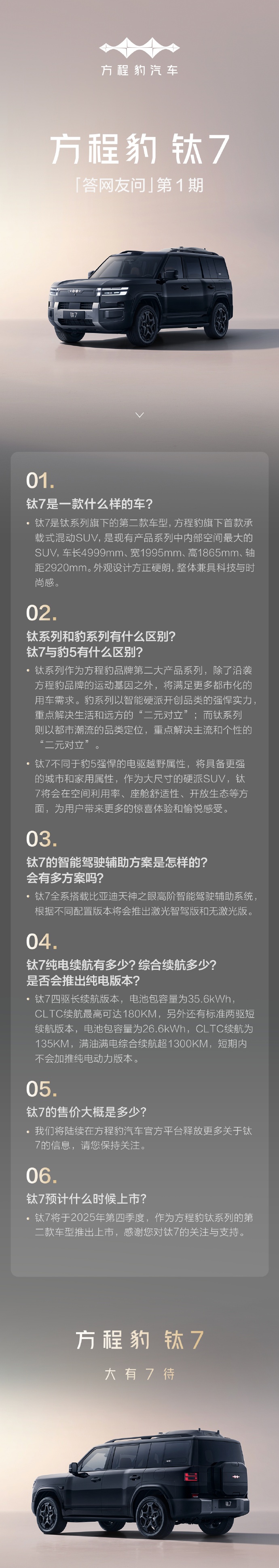 IT之家 7 月 19 日消息,比亚迪方程豹昨晚发布“钛 7 答网友问第 1 期”,针对新车的部分信息以及上市时间进行了披露。