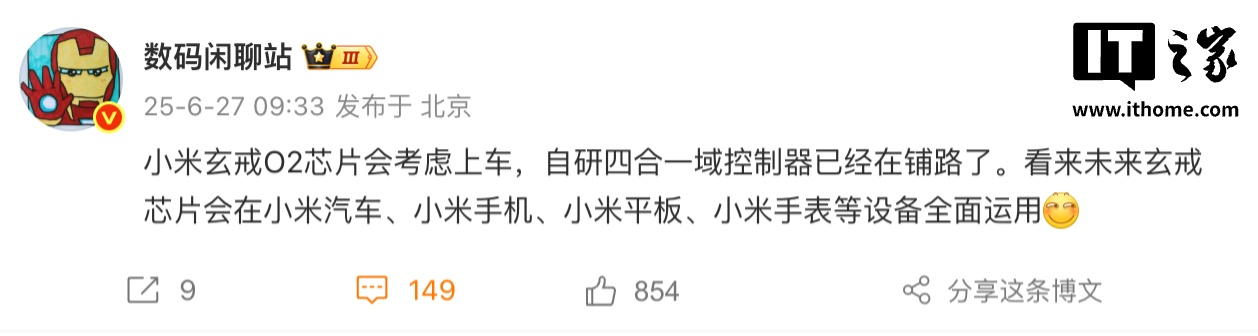 IT之家注意到,此前博主 @数码闲聊站 也爆料称,小米玄戒 O2 芯片“会考虑上车”,小米自研的四合一域控制器已经在为此而做准备。其表示,“看来”未来玄戒芯片会在小米汽车、小米手机、小米平板、小米手表等设备全面运用。