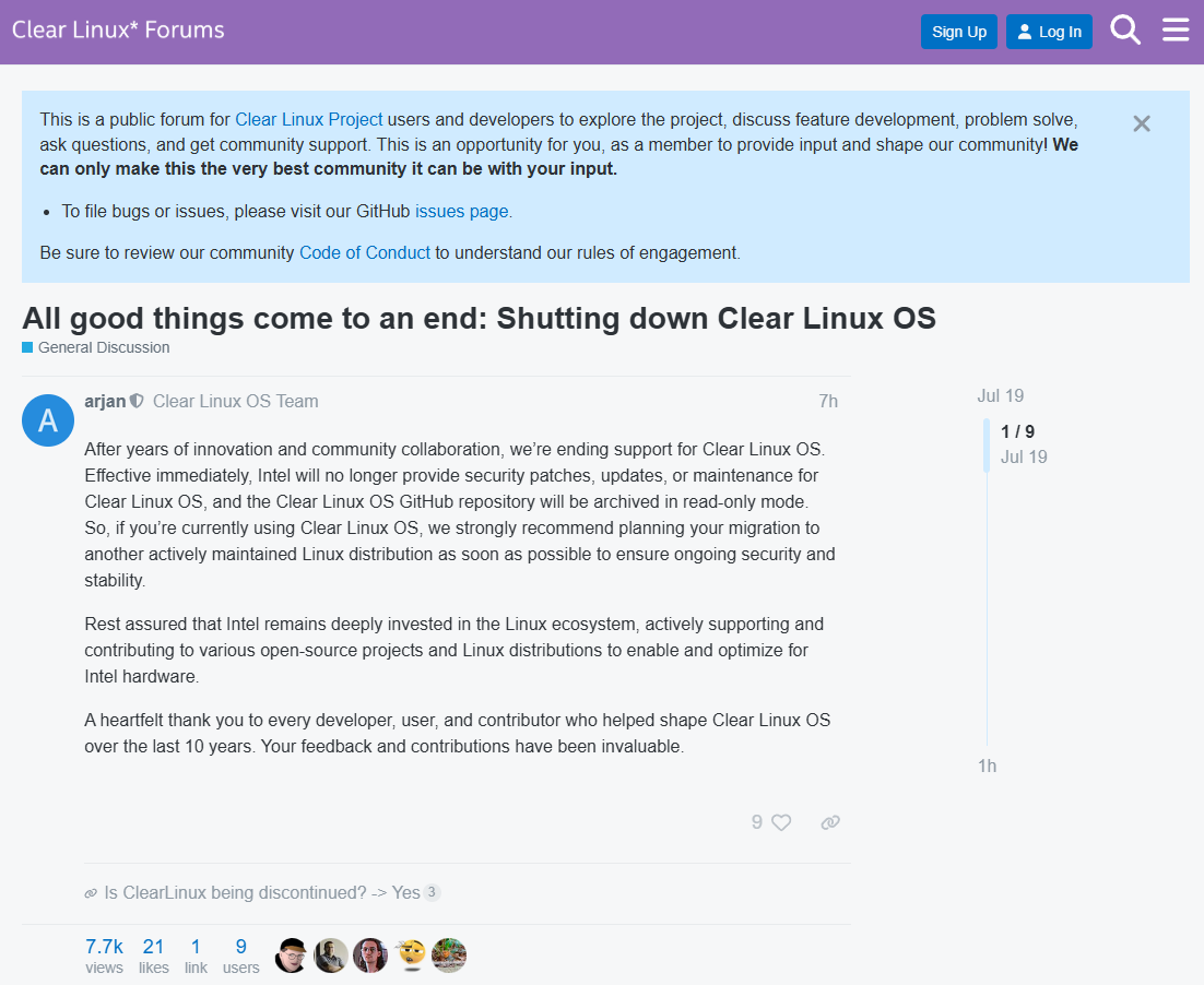 过去十年间,Clear Linux 展现了其在 x86_64 硬件上不俗潜力,而且哪怕是在 AMD 平台上也表现出了出色的性能。但随着英特尔的成本削减和裁员行动,Clear Linux 即将终止开发。