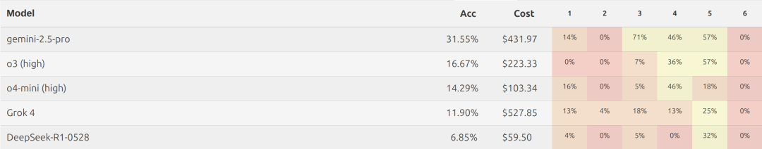 在他们的测试中,即使是表现最好的 Gemini 2.5 Pro 也只获得了 13 分(31%),远低于铜牌线 19 分。