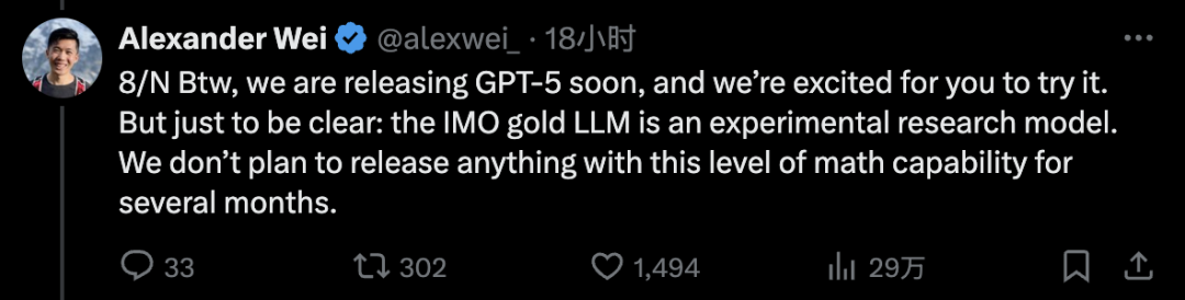 OpenAI 员工 Alexander Wei 还透露,GPT-5 即将发布,但 IMO 金牌模型是一个实验性研究,在几个月内都没有计划发布。