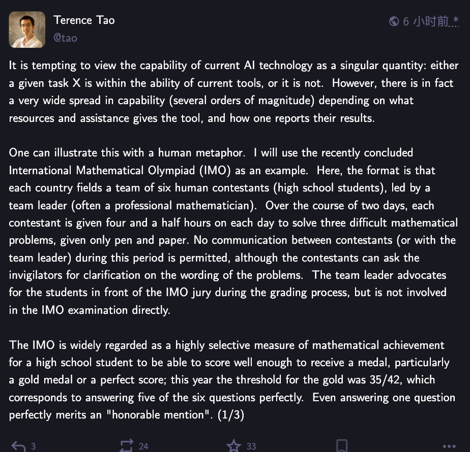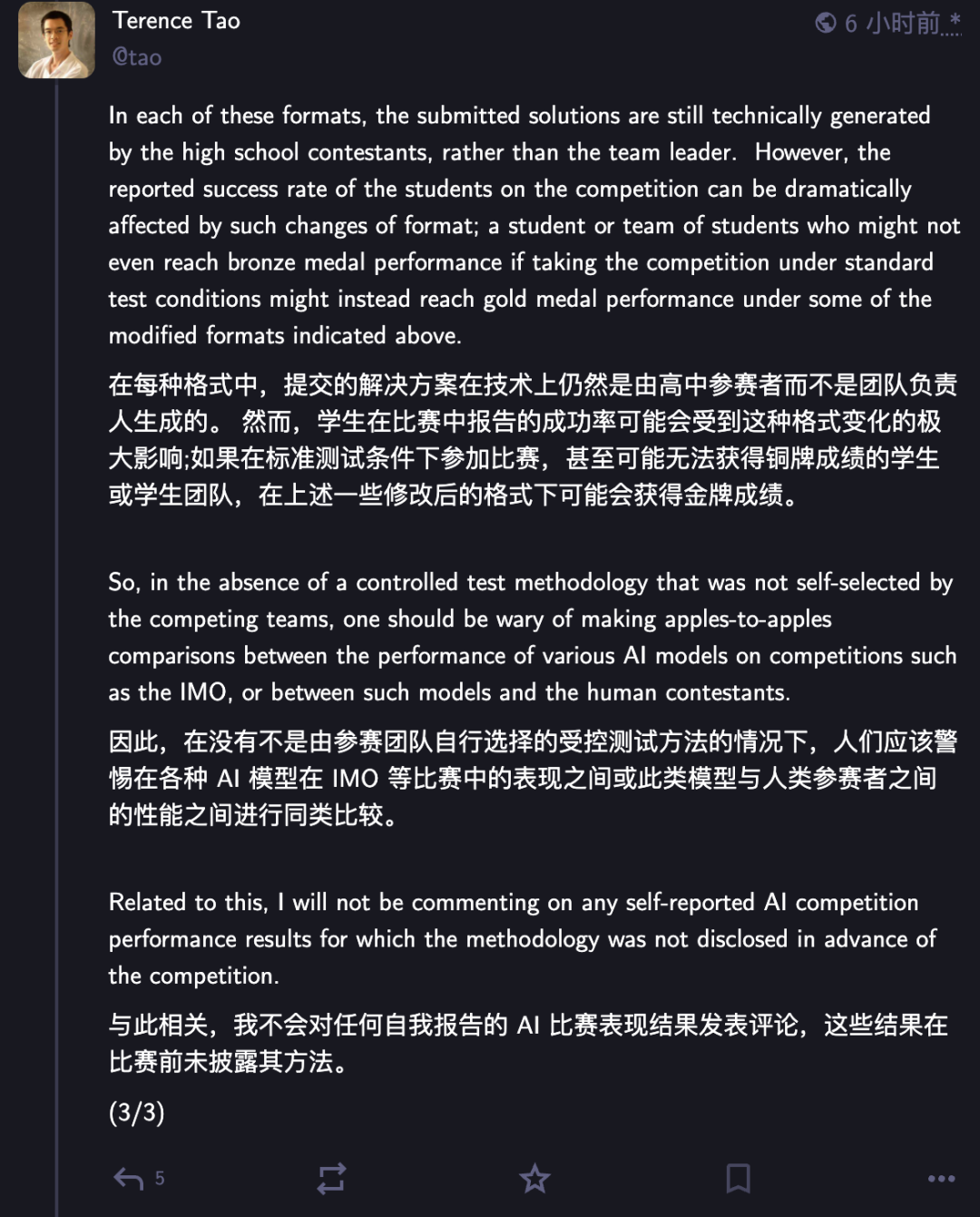 他特别强调:“在没有预先公布方法论的情况下,不会对任何自我报告的 AI 竞赛表现发表评论。”