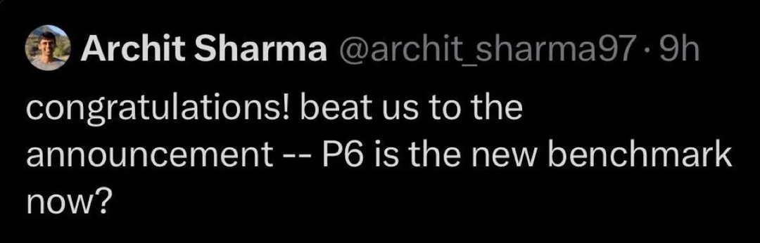 不过这一次,DeepMind 研究员 Archit Sharma 在 OpenAI 宣布后回复:“恭喜!抢在我们前面宣布了 —— 第 6 题是新的基准了吗?”
