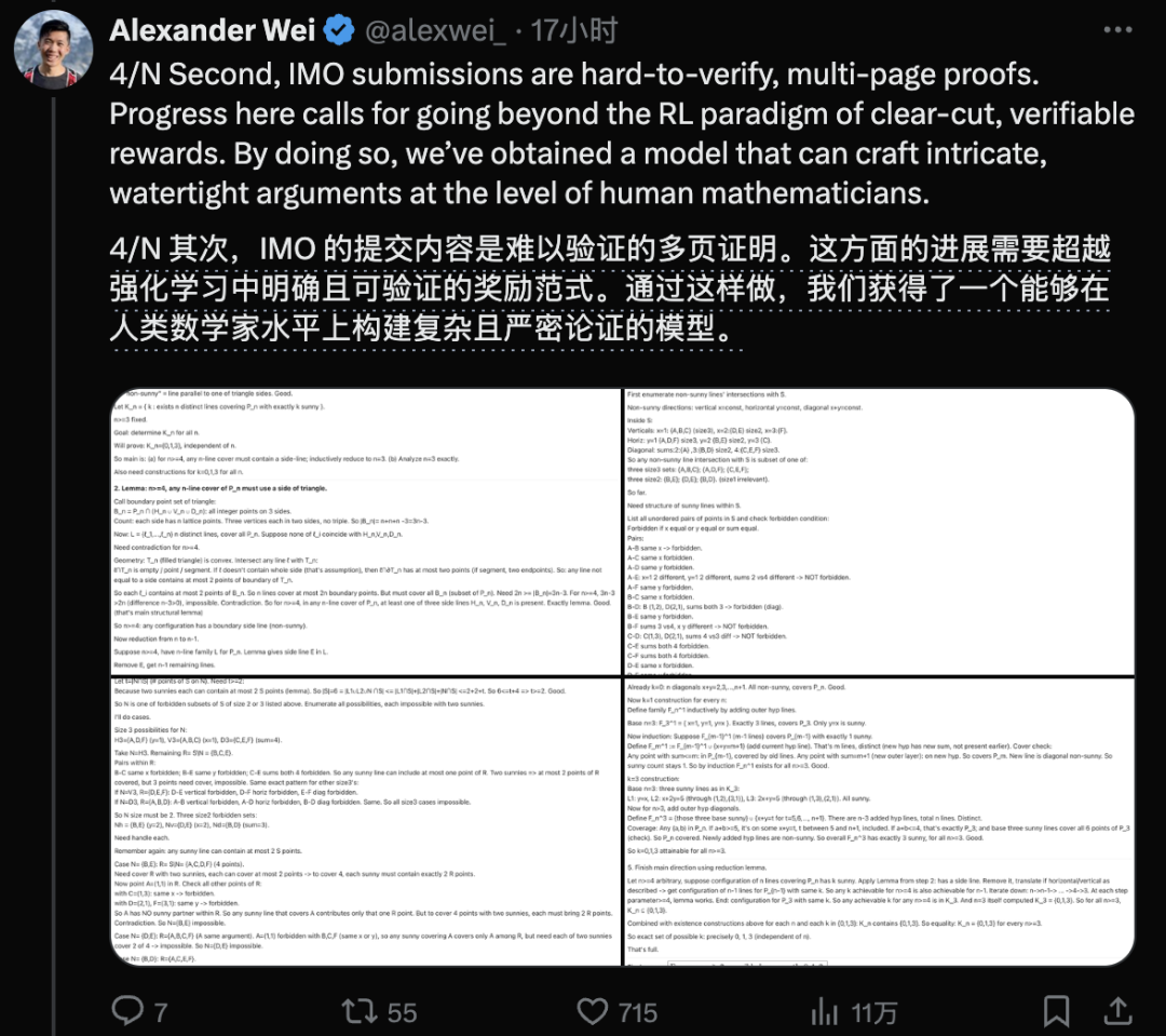 更重要的是,IMO 的答案是难以验证的多页证明,这与之前那些有明确正确答案的数学题完全不同。OpenAI 团队表示,他们突破了传统强化学习中依赖明确可验证奖励的范式,创造出了能够像人类数学家一样构建精巧论证的模型。