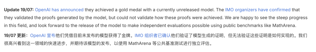 MathArena 团队也同步更新了 OpenAI 宣布实验模型拿到 IMO 金牌的消息:
