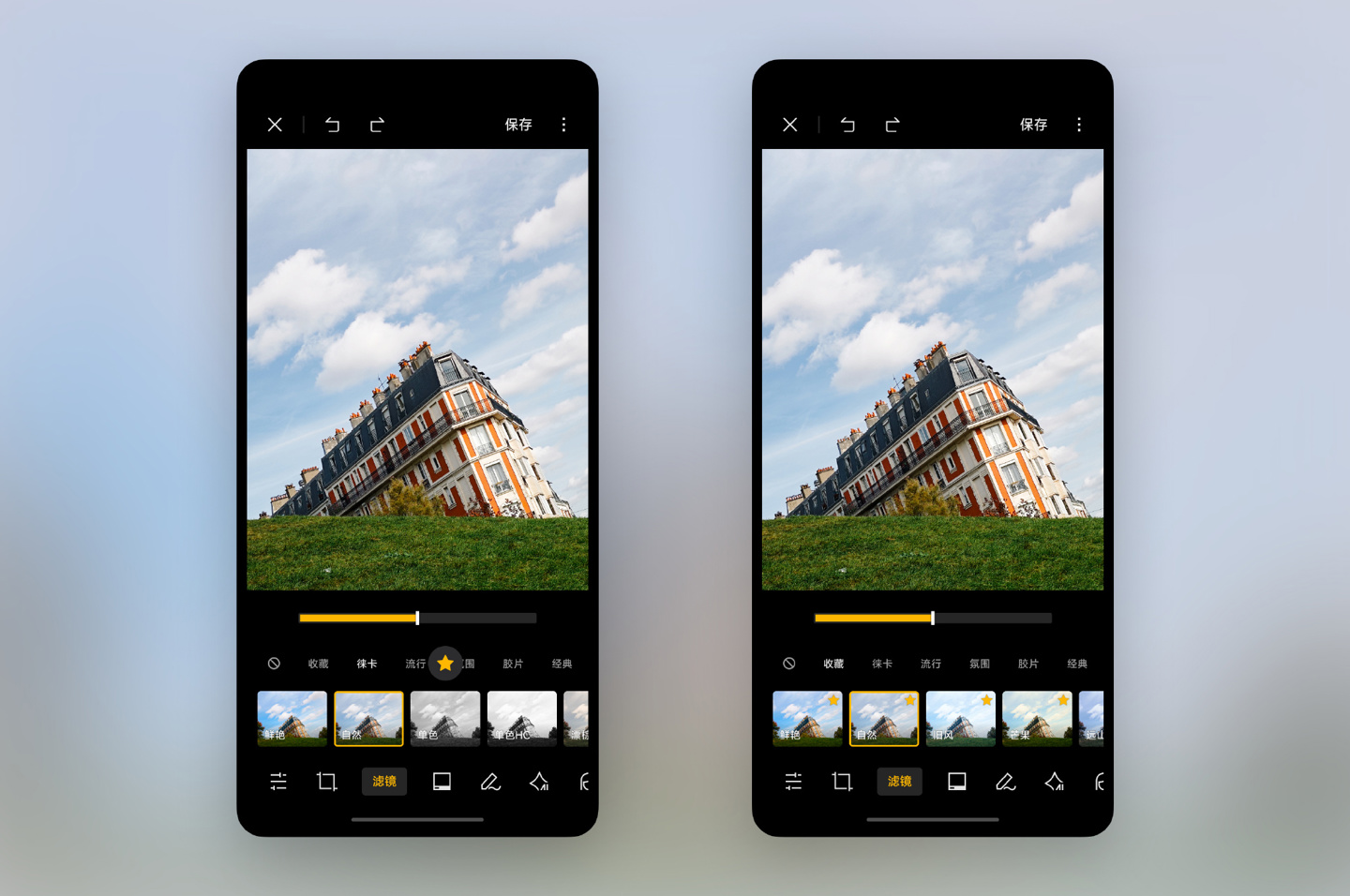 滤镜功能小升级,底部的滤镜预览选项支持显示原图 + 滤镜的效果,用户可以在预览小图能直观看到效果应用的效果,同时也可以通过长按滤镜把自己喜爱的滤镜样式进行收藏。