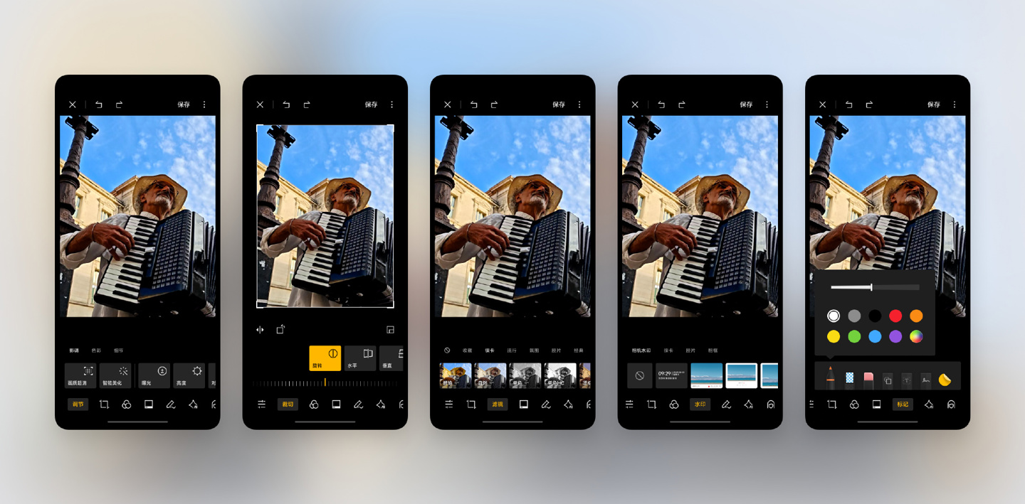 调整交互架构,把用户最高频使用的裁切、调节、滤镜、水印、文字、涂鸦等功能进行了一二级合并,在不同功能切换效率会大幅度提升,操作更高效。