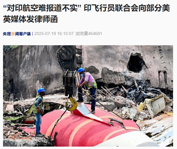 IT之家 7 月 20 日消息,据央视新闻报道,当地时间 7 月 19 日,印度飞行员联合会已经对《华尔街日报》和路透社发出正式法律信函,表示要采取法律行动,要求他们就有关印航空难的不实报道道歉。