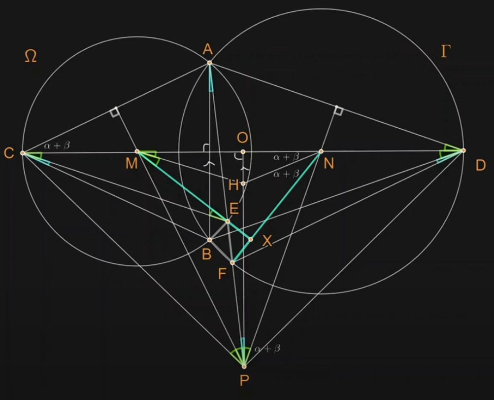 解析设定和参数。设 P 为三角形 ACD 的外心。连接 AP 与两个圆 Ω、Γ 的交点分别为点 E、F。求过点 B、E、F 的外接圆方程。