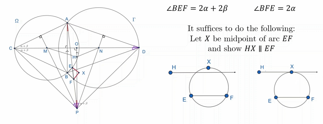 不过,这个问题可以换成另一种表述:定义 X 为不包含 B 的一侧的 EF 的中点,如果能够证明 HX 与 EF 平行,基本上就可以证明这个结论了。