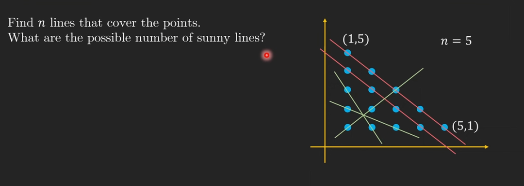 可以看出,解答这道题的关键点,就是要找出覆盖点的 n 条线,以及阳光线的可能数量。