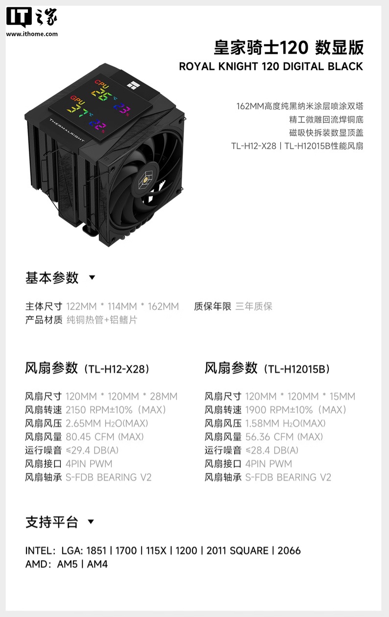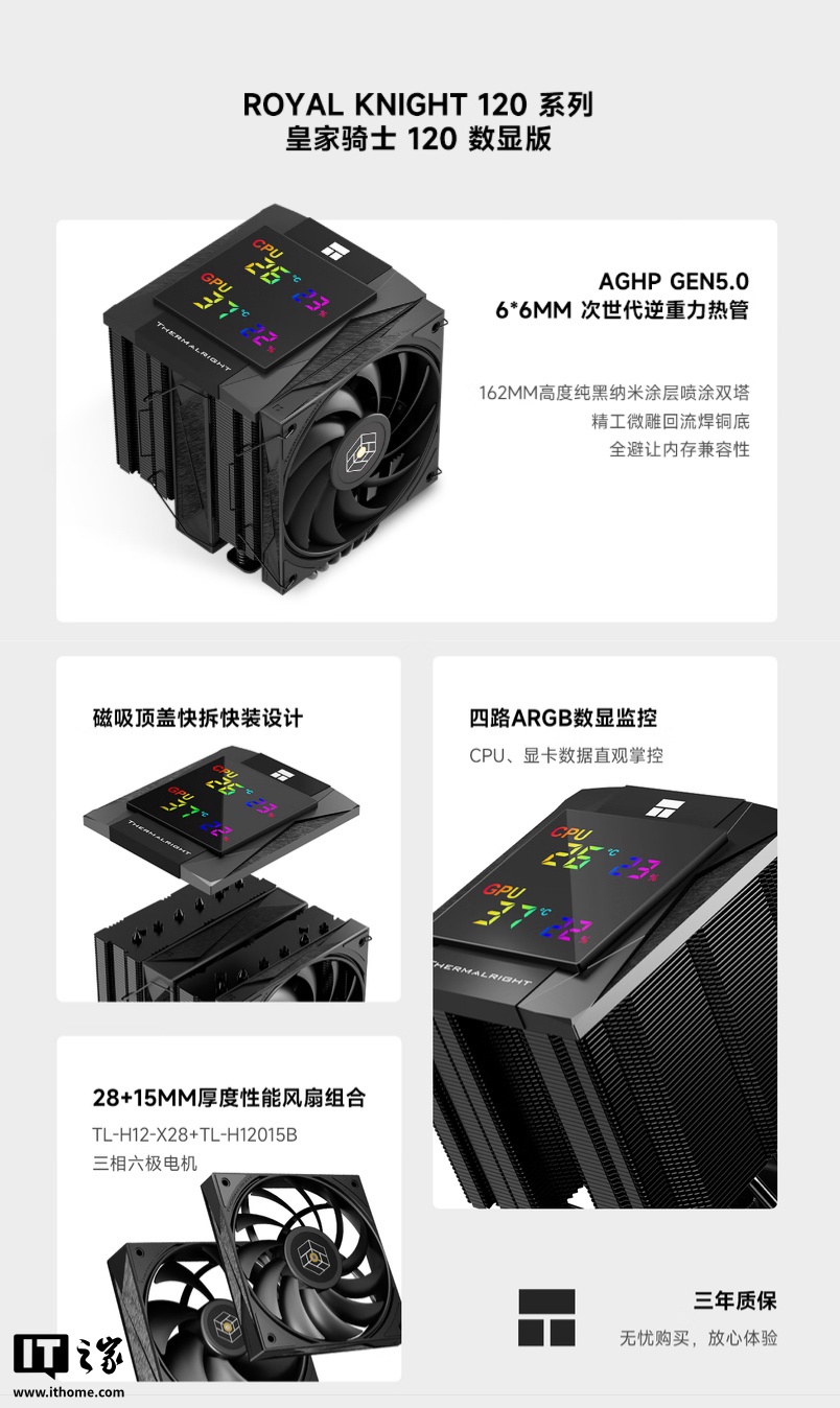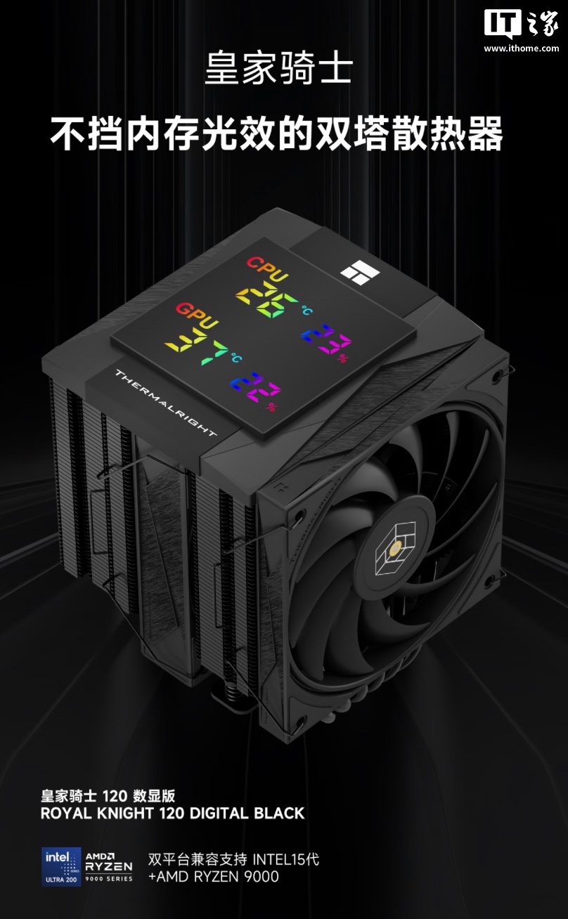 IT之家 7 月 19 日消息,Thermalright 利民旗下 Royal Knight 120 Digital“皇家骑士 120 数显版”风冷散热器现已在京东开启首销,黑白配色定价均为 275 元。