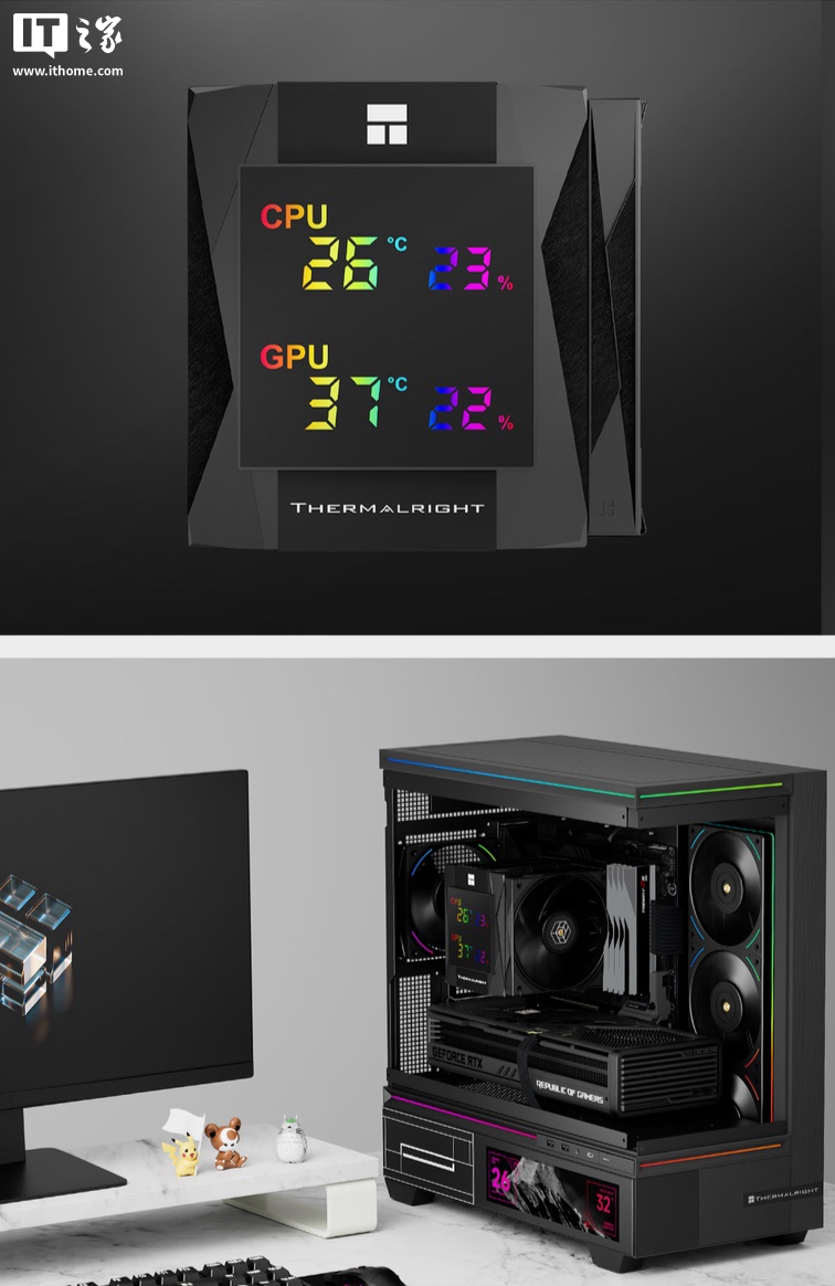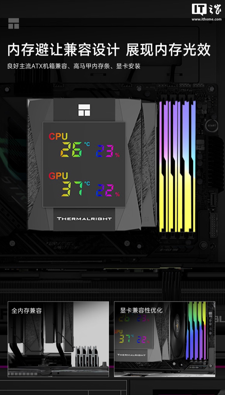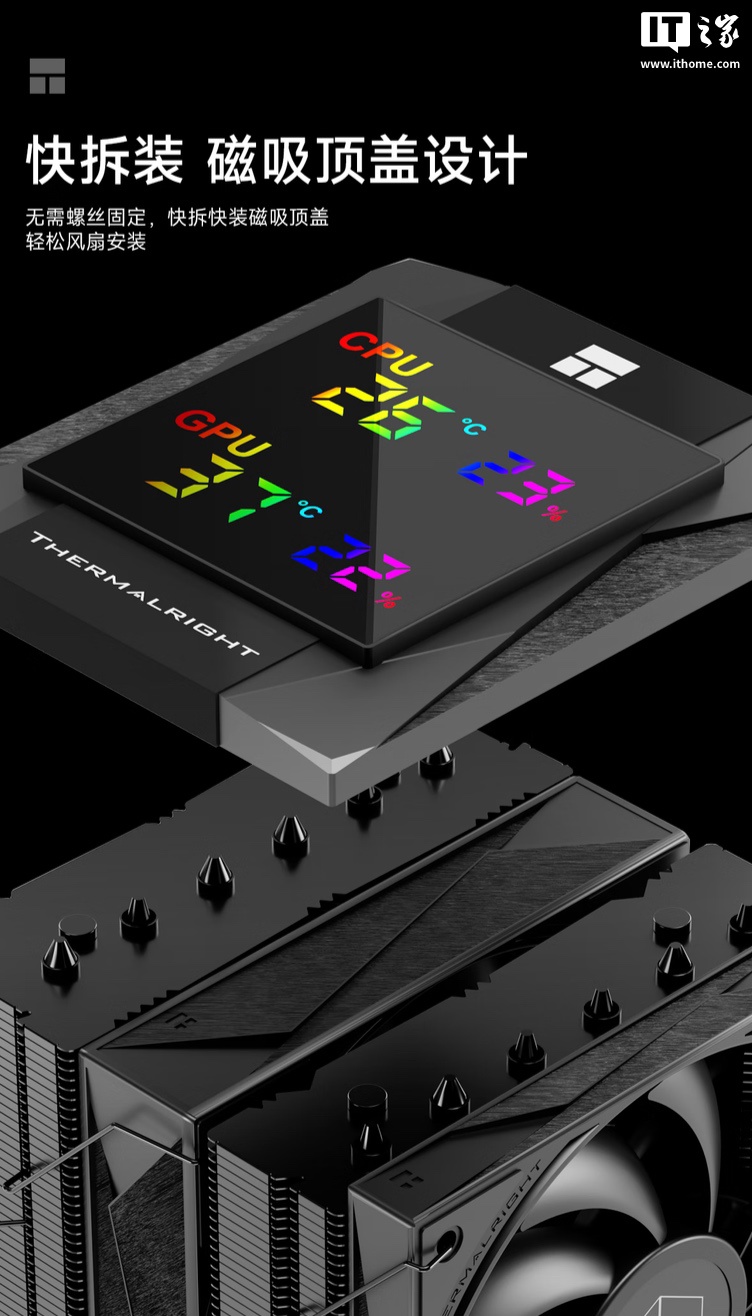 据介绍,这款风冷散热器配备磁吸式幻彩数显顶盖,支持监控 CPU 温度与占用率、GPU 温度与占用率,塔体外部采用 12015 薄款风扇以避免阻挡内存模组顶部灯条光效。