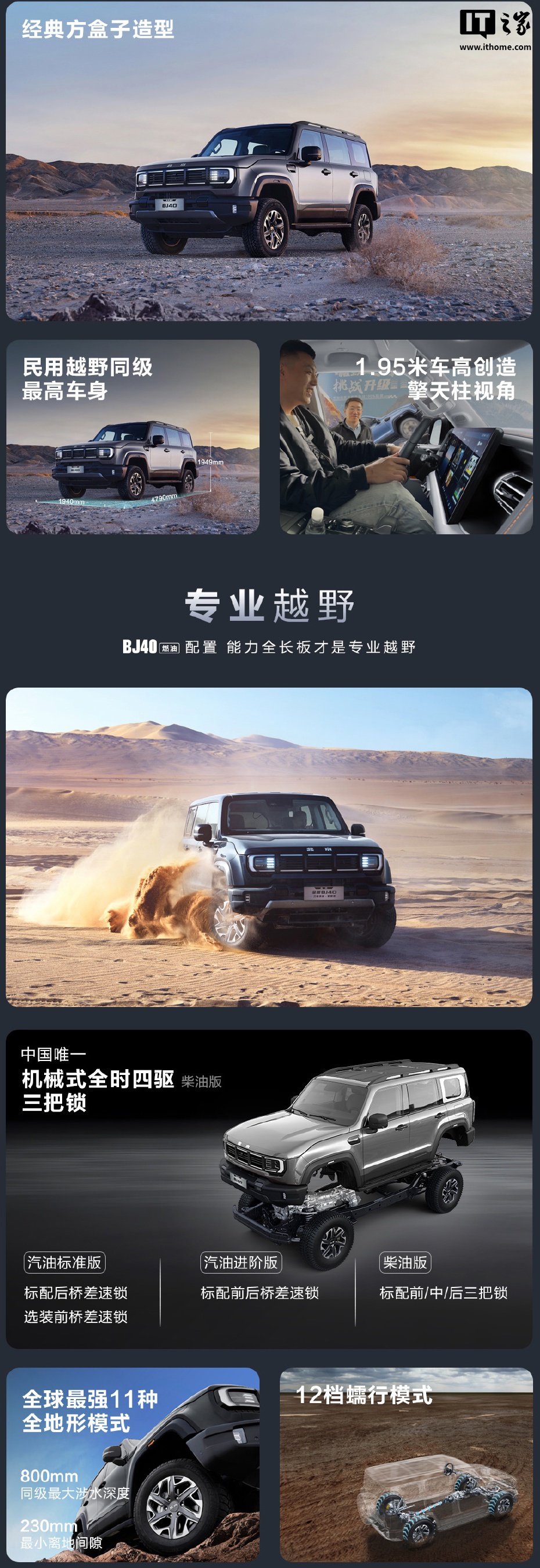 IT之家 7 月 19 日消息,北京越野宣布旗下 2026 款北京越野 BJ40 燃油版上市,系列车型提供标准版、进阶版、柴油版三种款型及越野 60 年特别版和摇滚 40 年纪念版两款特别版,其中越野 60 年特别版限量 60 辆,摇滚 40 年纪念版限量 40 辆,官方指导价为 14.99 万元起,焕新价 12.69 万元起。