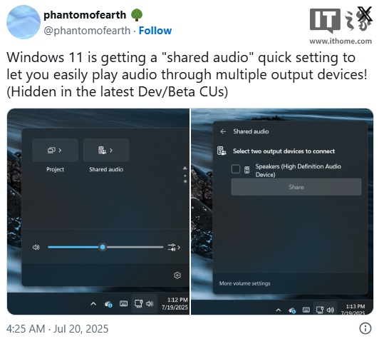 X 用户 phantomofearth 分享的截图显示,在 Windows 11 设备的快速设置面板中,新增了一个“共享音频”按钮,位于“投影”按钮旁边。点击该按钮后,会显示与电脑连接的所有音频设备,用户可以勾选想要播放音频的设备,然后点击“共享”按钮,即可实现在多个扬声器上播放声音。