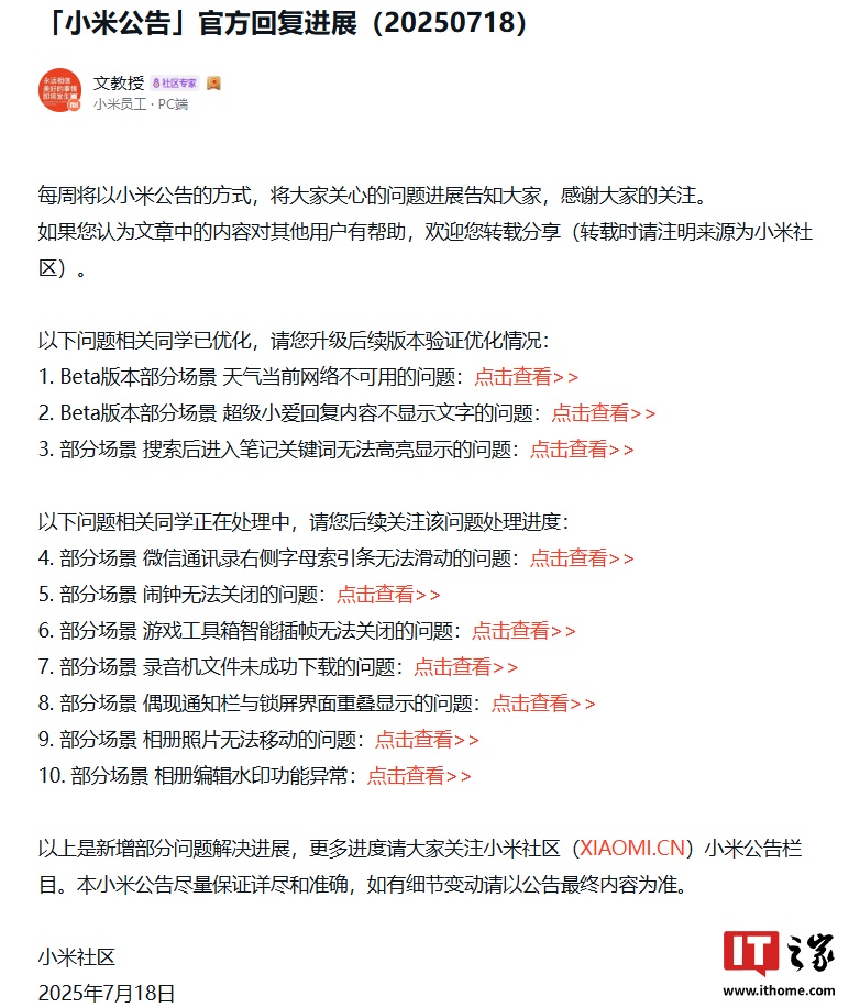 IT之家 7 月 20 日消息,小米员工本周(7 月 18 日)在小米社区发布公告,对小米澎湃 HyperOS 问题处理进展进行公布,其中提到了 Beta 版本部分场景天气当前网络不可用、超级小爱回复内容不显示文字等问题的优化情况。